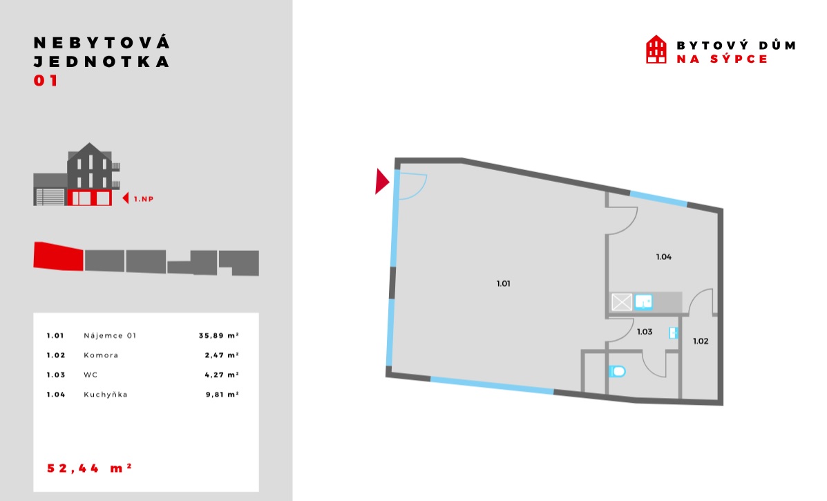Dispozice: obchodní prostor (kavárna) 36m2, kuchyňka/zázemí 10m2, komora 2,5m2, WC 4m2 Orientace V a J.